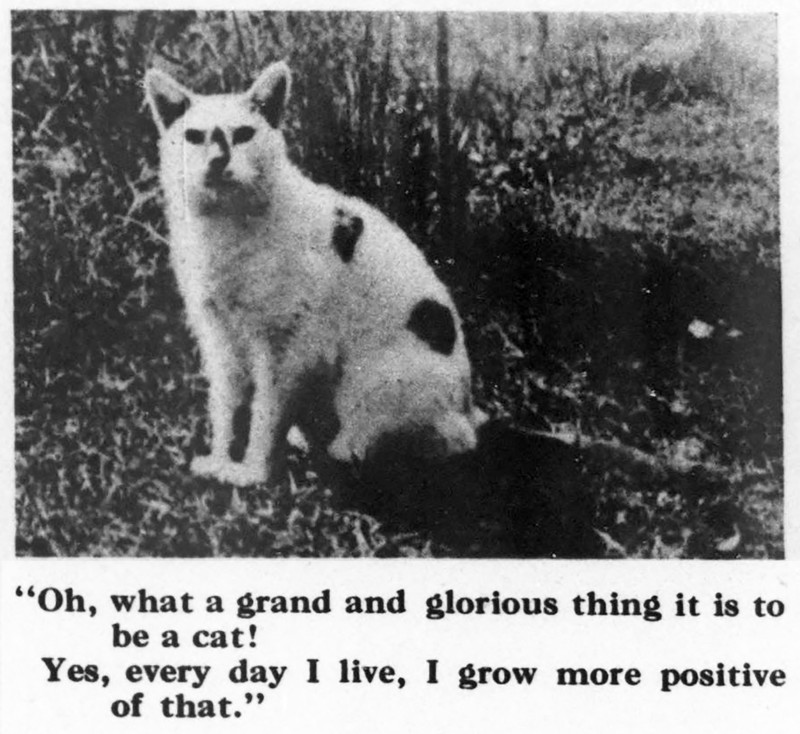 "Oh, what a grand and glorious thing it is to be a cat! Yes, every day I live, I grow more positive of that." From the Massachusetts Society for the Prevention of Cruelty to Animals' Our Dumb Animals, 1915.