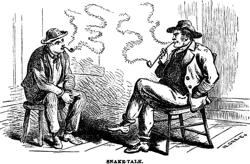 The serpents are emblazoned with death, destruction, murder, mischief, madness, brutality, robbery, and blasphemy. From The Working Man's Friend and Family Instructor (1833). The caption reads: "Will you take a glass?"