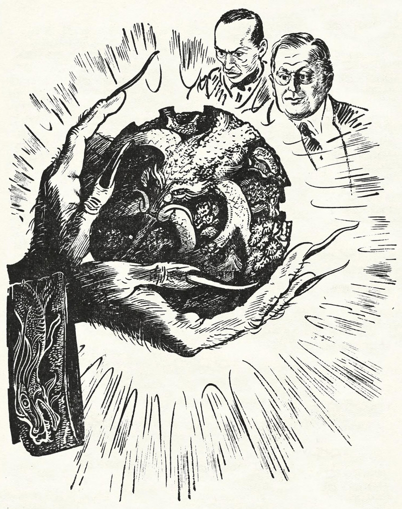 Here's a precursor to the ornate puzzle box that unlocks diabolical dimensions in the Hellraiser films. The spherical nature of this device also recalls the Phantasm films. From Unknown, 1943.