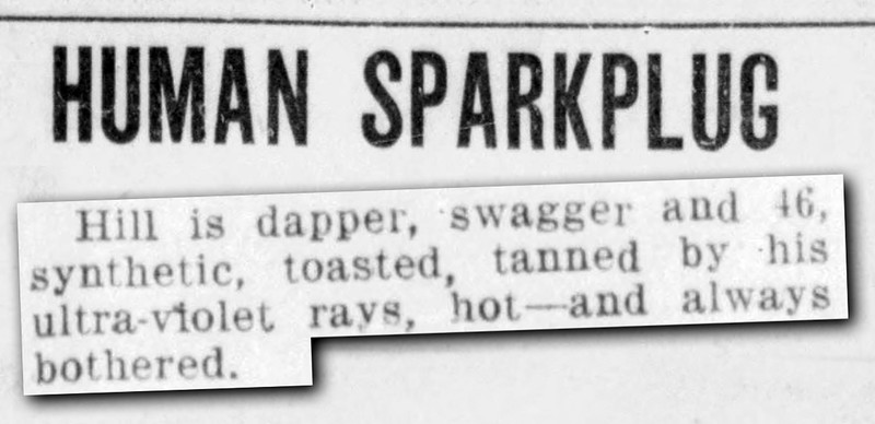 A description of the sloganeer for Lucky Strike cigarettes, George W. Hill. "Hill is dapper, swagger and 46, synthetic, toasted, tanned by his ultra-violet rays, hot—and always bothered." From the [Xenia] Evening Gazette, 1931.