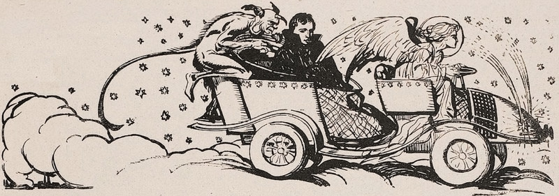 Here's a precursor to the Ford Mercury automobile, ten years before it debuted. From Die Bühne, 1928. (Indeed, it's technically Lohengrin and not Mercury thanking Mr. Ford for the ride, but that winged hat!)