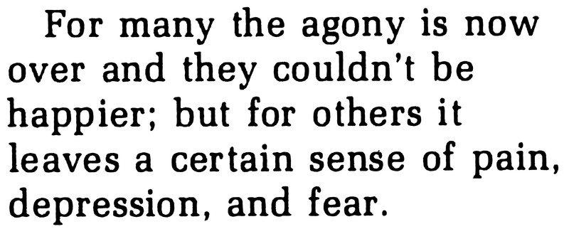 "For many the agony is now over and they couldn't be happier; but for others it leaves a certain sense of pain, depression, and fear."