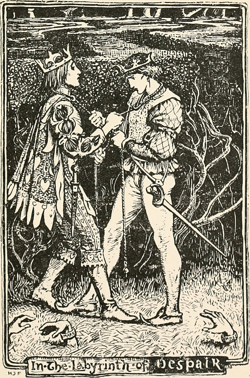 A duck-headed butler opening the door for a Poe-esque gentleman? Check. (By the way, that's a precursor to David Lynch's commercial for the Sony Playstation, in which a duck says, "Welcome to the 'third place.'") A faceless figure surrounded by disembodied cackling faces? Check. A crow in a jacket standing on a meditative sheep while an anthropomorphic dice cup spills and kills an innocent bystander? Check. A skeleton holding the Ace of Hearts? Check. Edward Gorey-esque despair on a settee? Check. Granted, the figure blowing his head off does seem rather too much. From Judy, Or The London Serio-Comic Journal, 1884.