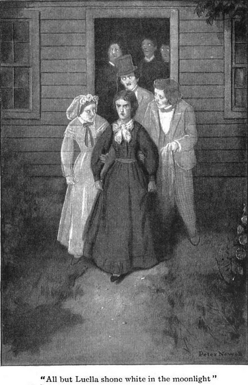 An illustration from an 1895 issue of Pall Mall magazine. The caption reads: "She cautiously ventured one foot into the black-looking water."