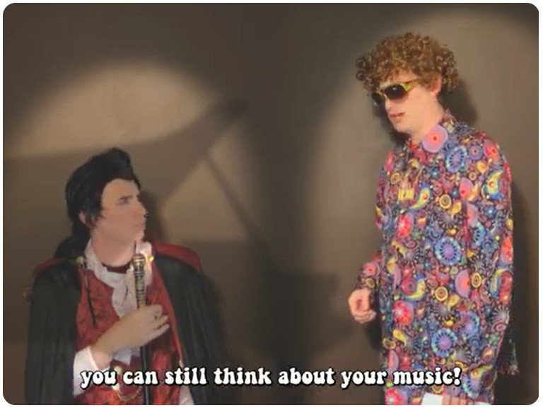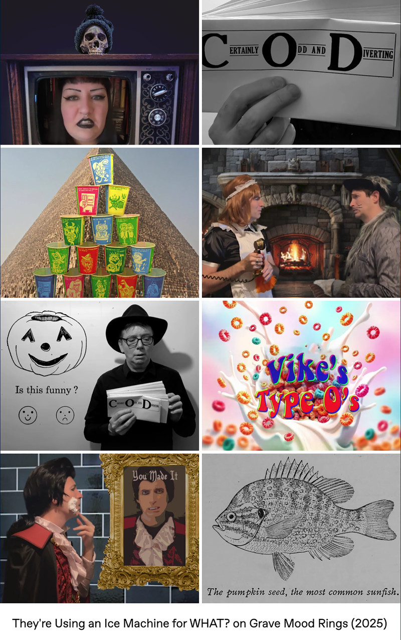 Parody analog horror meets 1970s tropes (like pet rocks, lava lamps, disco music, bell-bottom pants, mirror balls, and of course mood rings) in the web series Grave Mood Rings. It pokes fast fun at classic slow-moving Gothic soap operas like Dark Shadows and the Canadian series Strange Paradise. In addition to a vampiric Viscount, a castle is home to a groovy Doctor (a phlebotomist, naturally), a jolly housekeeper with her own laugh track, a werewolf Vicar, and an arch-nemesis riddler wearing a Sphinx mask. Corny wordplay, the occasional bizarre sing-a-long, and haunted doughnuts punctuate the proceedings, in the tradition of the sketch comedy of MadTV, Kids in the Hall, and SCTV.