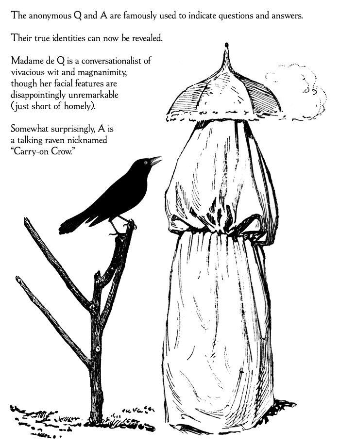 Unnecessary Attribution (of brief, public-domain utterances) by literary rapscallion Jonathan Caws-Elwitt Prof. Oddfellow adds: In the word of the great statesman and martyr, Abraham Lincoln, "Alas!" As the legendary Mae West once exclaimed, "Funny!" In the word of the great Persian poet-astronomer, Omar Khayyam, "Who?" To quote the eminent Frenchman, Rousseau, "Indeed!" In the word of the great American slavery abolitionist, Frederick Douglas, "Never." As the celebrated Dr. Johnson once asked, "Why?" In the word of the great Italian poet-philosopher Giacomo Leopardi, "Oh!"