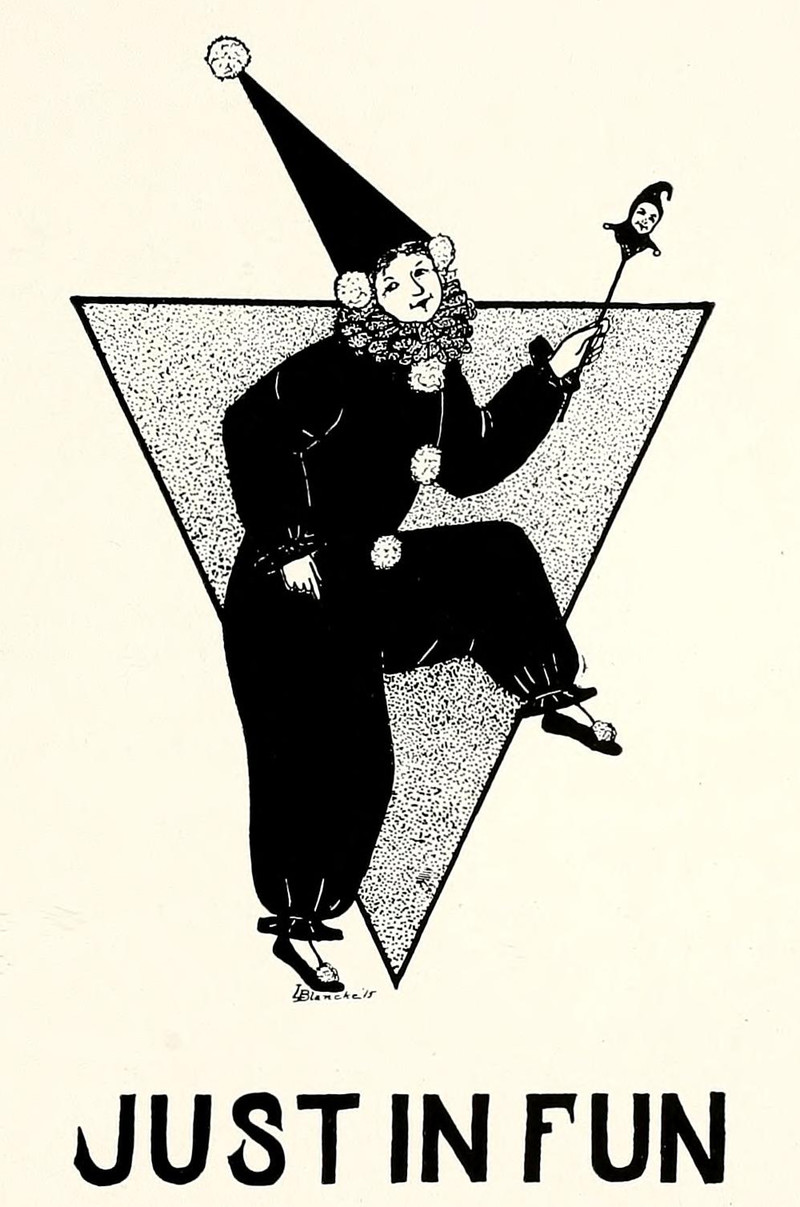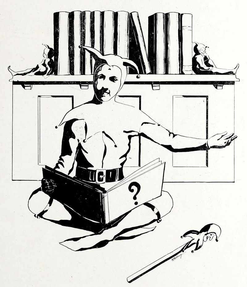 It's clearly not the jester who is throwing the playing cards. It's the marotte -- the belled horns of its collar are actually tentacles. From Anderson College's 1918 yearbook.