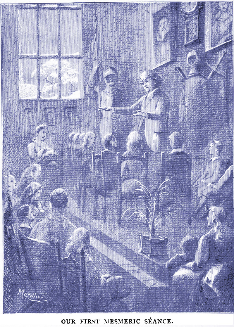 "A Séance on the Ice": an illustration from The Children's Fairy History of England by Forbes Edward Winslow (1889). The caption reads: "What! Mesmerise you on the ice! Well, I never! Did any one ever hear of such a thing? Oh, you all want it, do you? Well, I will try. You need not take off your skates. I will mesmerise you skating, and we will be here, and there, and everywhere, at the same time. Just come close round me and look at me; don't speak, simply watch my hands. * * * * * * *"