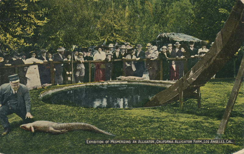 Here's a precursor to "the golden eyes of the mesmerized alligator" (George Newtown, in Louisiana in Words). The postcard caption reads: "Exhibition of mesmerizing an alligator, California Alligator Farm, Los Angeles." Date uncertain.