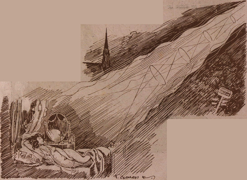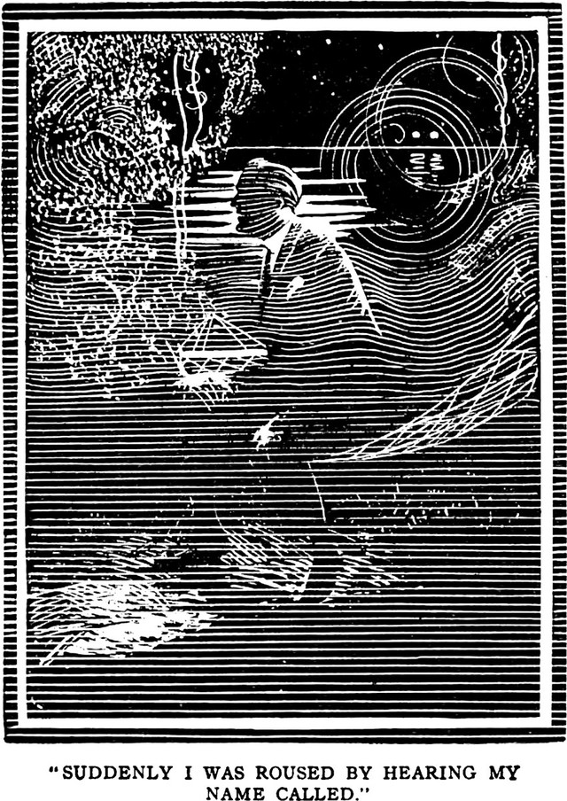 An illustration from The Deer Smellers of Haunted Mountain by John J. Meyer (1921). The caption reads: "Hunting for apartments and vacant perfect worlds in the space deeps of the universe."