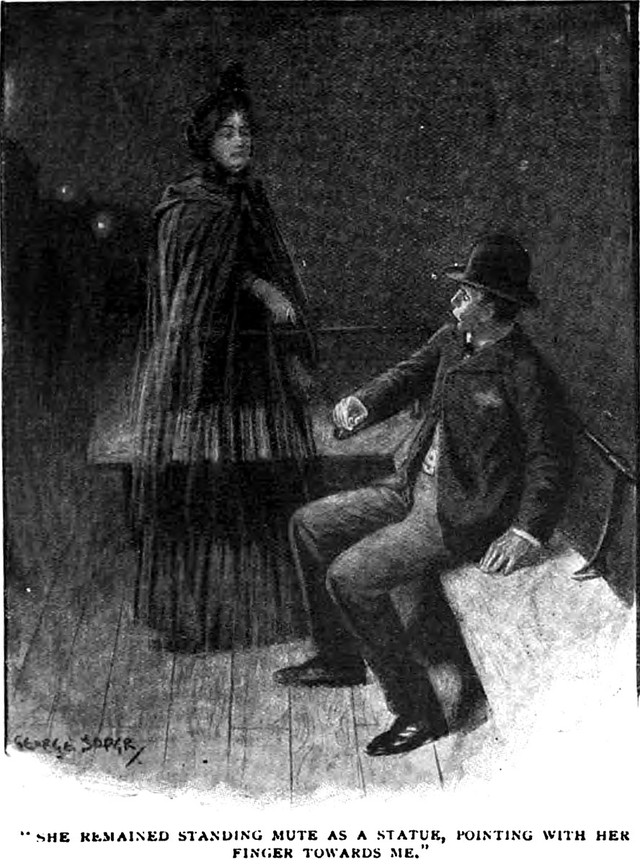 An illustration from a 1902 issue of The Strand magazine. The caption reads: "Either you are the spectre, or it is supernatural."