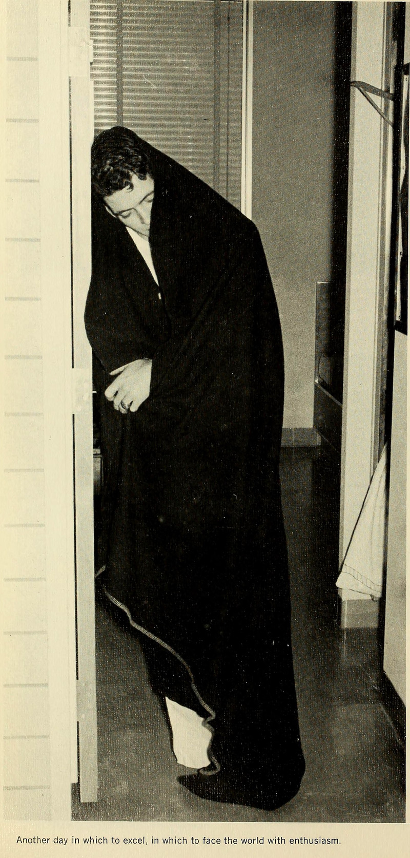 The caption says, "Another day in which to excel, in which to face the world with enthusiasm."  From the United States Naval Academy's 1964 yearbook.