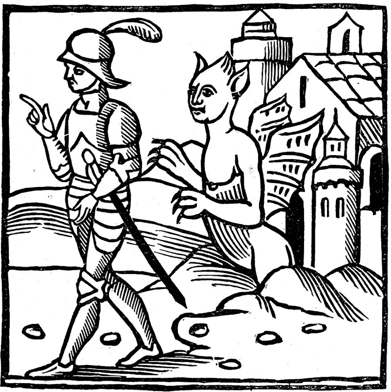 The central figure is perhaps wondering, "So it's snakes, wings, and fire on the one side, and what's the other side promising again?" From The New England Primer by Heman Humphrey, 1830. Speaking of which, what exactly are a snowball's chances in hell? See A Snowball's Chance in Hell.