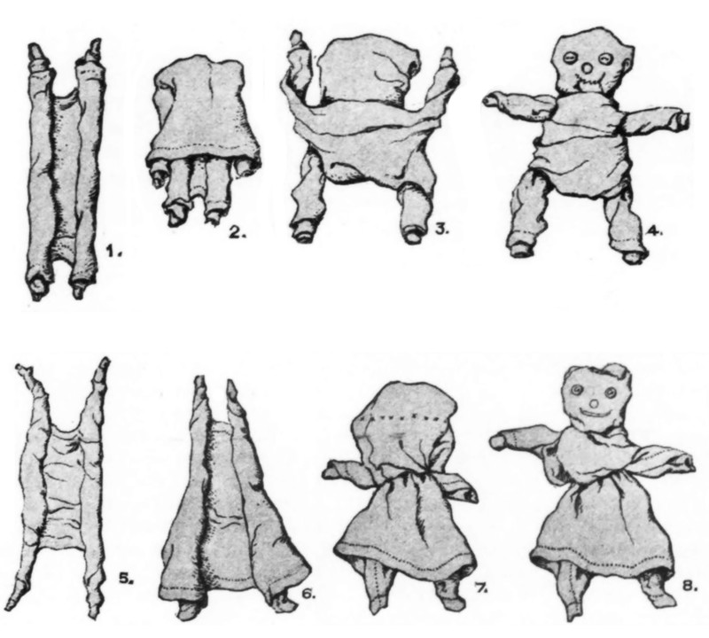 This is the way the fairies are made: From opposite sides, roll a handkerchief toward the centre, as shown in Fig. 1. If you wish to make a short fairy, roll it loosely; if a long-legged fairy, roll it tight; pull out the corners as you roll, and push the handkerchief up in the middle, as in Fig. 5. Fold the upper part over, like Fig. 2; draw the lower part up between the corners, as shown in Fig. 3. Tie the rolled corners behind the little figure’s back, and pull them out to make the arms, as shown by Fig. 4. To make the eyes, buttons can be sewed on, and a covered button can be used as a nose; a few stitches of red thread will suggest the mouth.