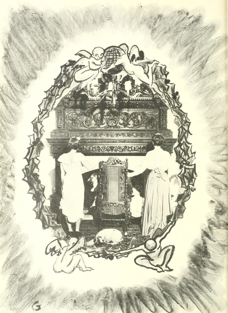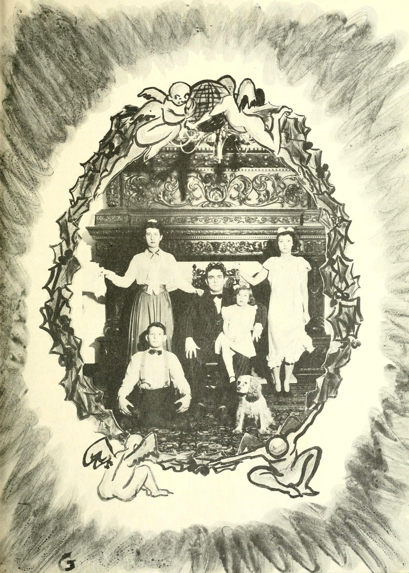 Nobody sends annual family portrait cards like this anymore. We especially like the one in which they're facing away from the camera or otherside hiding behind a chair. From Purple Parrot, 1942.