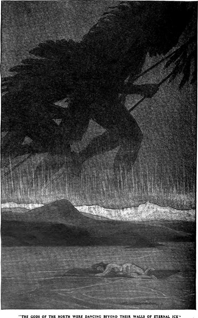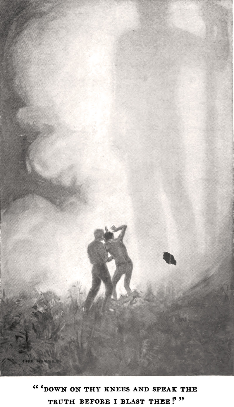 An illustration from The Mystery of June 13th by Melvin Linwood Severy (1905). The caption reads: "Down on thy knees and speak the truth before I blast thee!"
