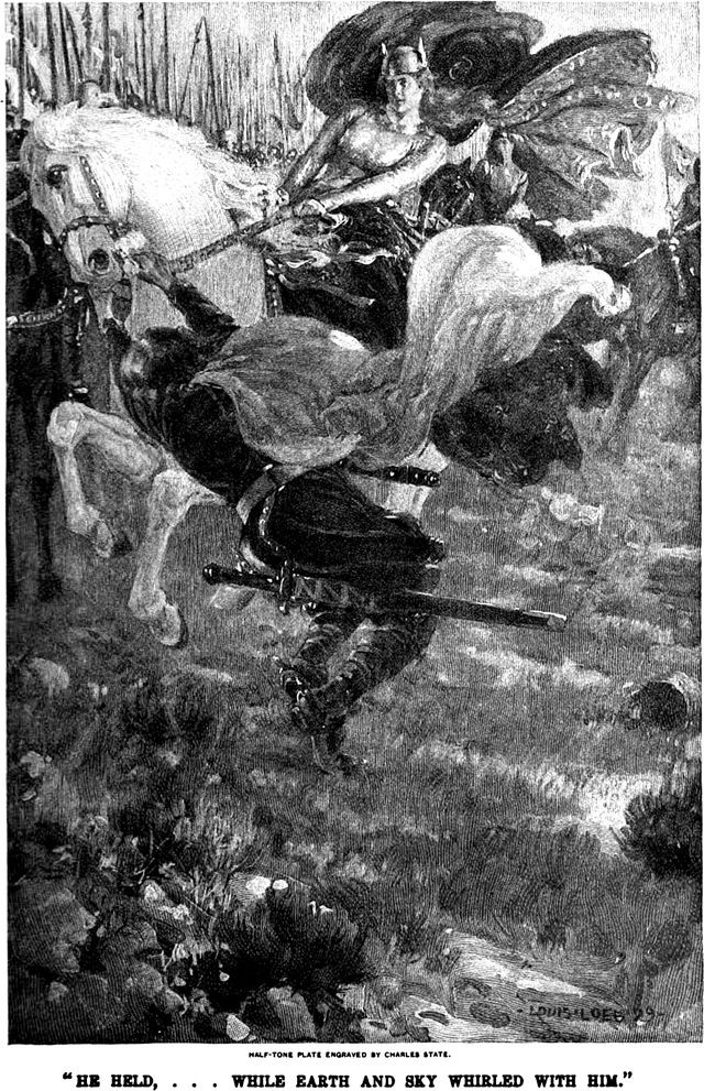 An illustration from an 1899 issue of Century Illustrated magazine. The caption reads: "He held while earth and sky whirled with him."