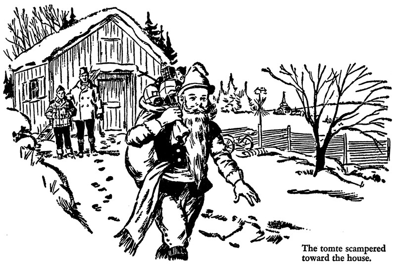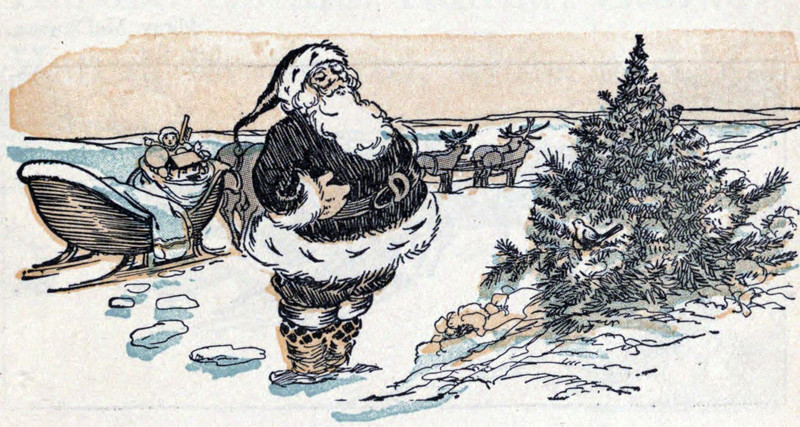 Answers: The doll is upside down in the foreground twigs. The mother's face is upside down at the base of the big pine tree. The rabbit stands in the twigs behind the girl's legs. The girls' sleeve is Santa's hat, with his face being her hand and his beard being a pine branch. From Wee Wisdom, 1930.