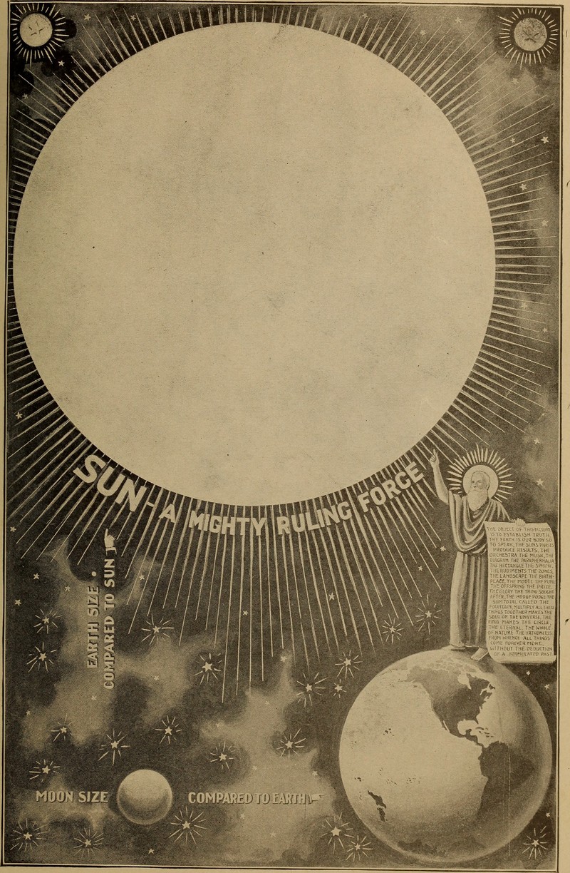 The variegated peoples of earth are here likened to an orbiting floral oracle that carries out the intentions of nature. From the Book of Heavenly Teachings by R. P. Baugh, 1912. The text reads (with all capitalizations and commas intact), "The Eye, Is a Member, Of all creation. In the Sight, Of Context, Is all Knowledge. Spirit is Neither Black nor White. Black Flowers. Brown Flowers. Red Flowers. Yellow Flowers. White Flowers. Flowers of Nature, In display, Of their varied formulas, In circular movements, That make this beautiful Bouqyet, An oracle, That forces its way, Through the laws of man, To carry out, Nature's Intent, And purposes."