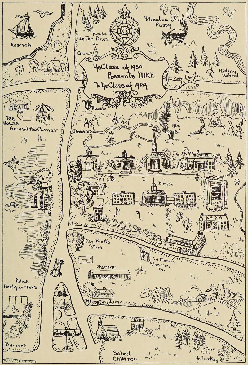 Though there's no sea serpent on this map, there is a giant pussycat and the charming inclusion of artists with easels (as well as a turkey in the corn and a place of dreams). Note also the sideways section at left middle. From Wheaton College's 1929 yearbook.
