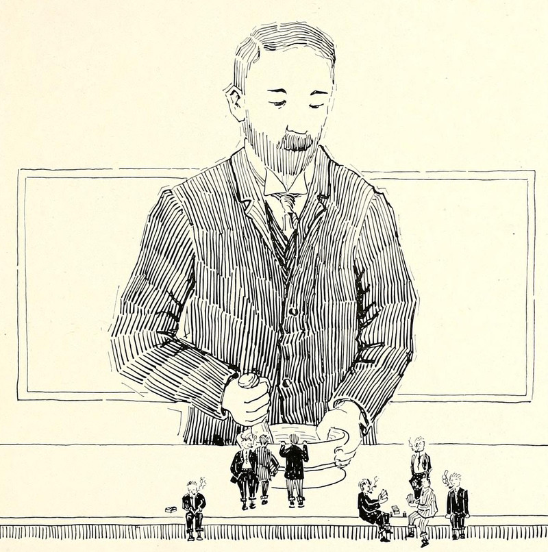 A pharmicist is making people small, decades before Steve Martin's comedy routine about getting "small" on placebo. From the University of Illinois at Urbana-Champaign's 1912 yearbook.