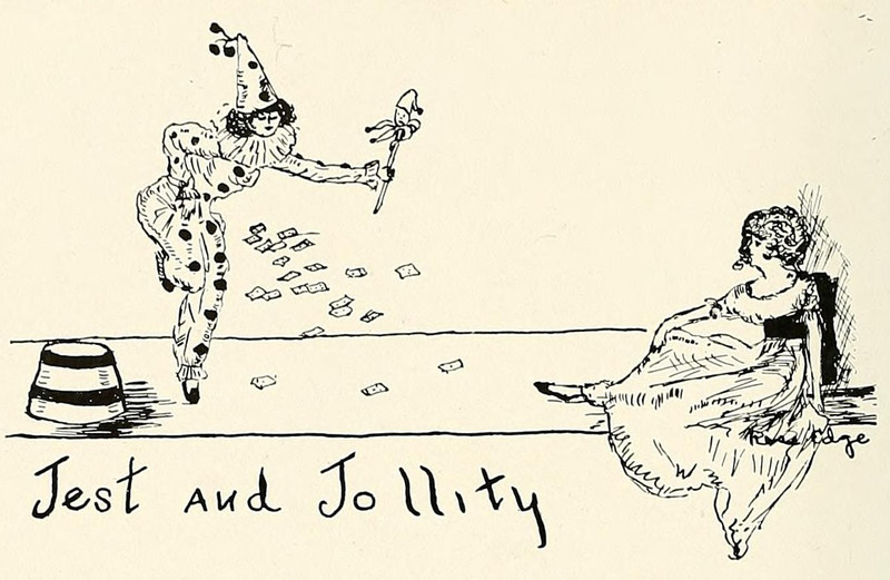 It's clearly not the jester who is throwing the playing cards. It's the marotte -- the belled horns of its collar are actually tentacles. From Anderson College's 1918 yearbook.