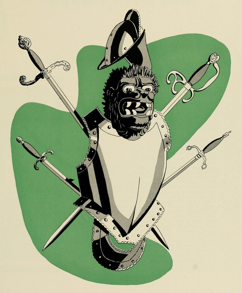 #vintage illustration #sword #vintage yearbook #yearbook #illustration #armor #1950s #ape mask