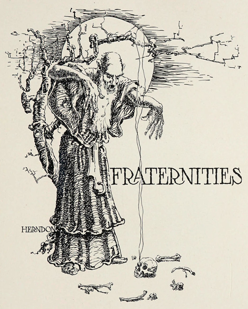 #vintage illustration #wizard #necromancy #skull #occult #fraternity #vintage yearbook #yearbook #1900s #illustration