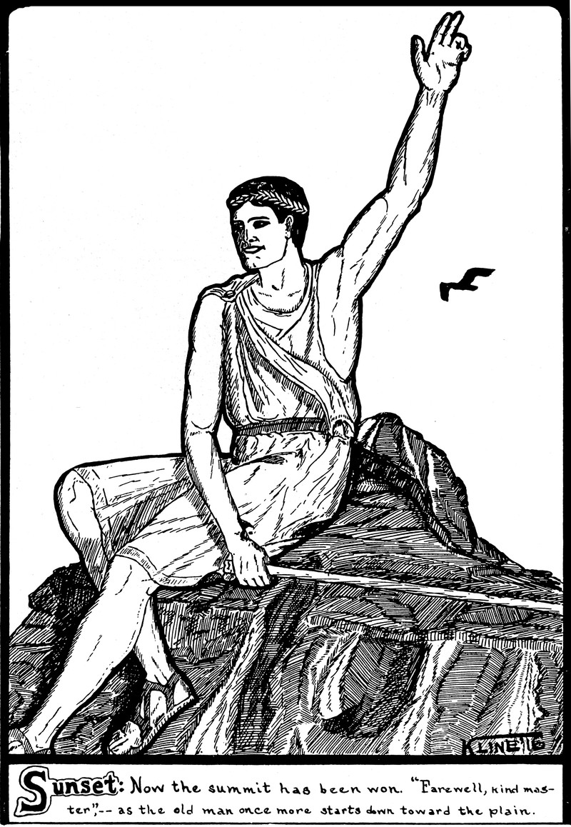 "Sunset: now the summit has been won. 'Farewell, kind master,' -- as the old man once more starts down toward the plain." From the Carthage yearbook of 1916.