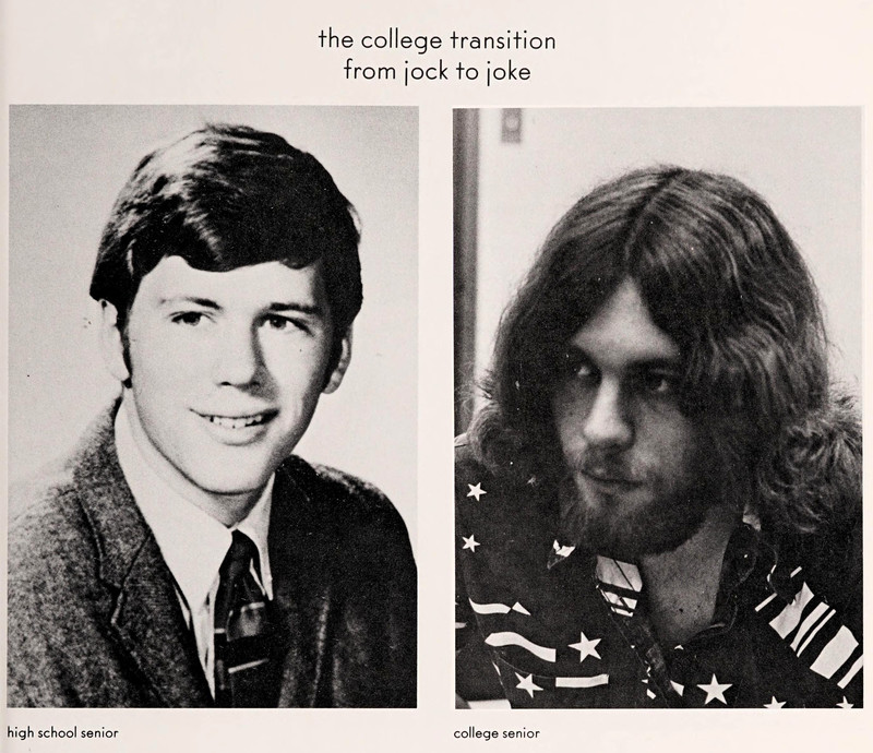 A bit harsh?  "The college transition from jock to joke."  From Morris Harvey's 1973 yearbook.