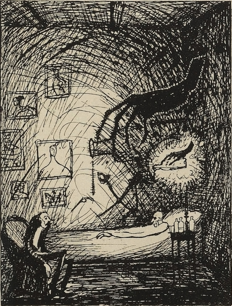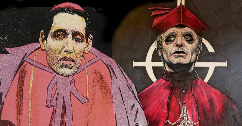 Here's a precursor to wonky-eyed Cardinal Copia from the superb band Ghost. From Lustige Blätter, 1902. (The portrait of Cardinal Copia in our collage is by maxime_draw69.)