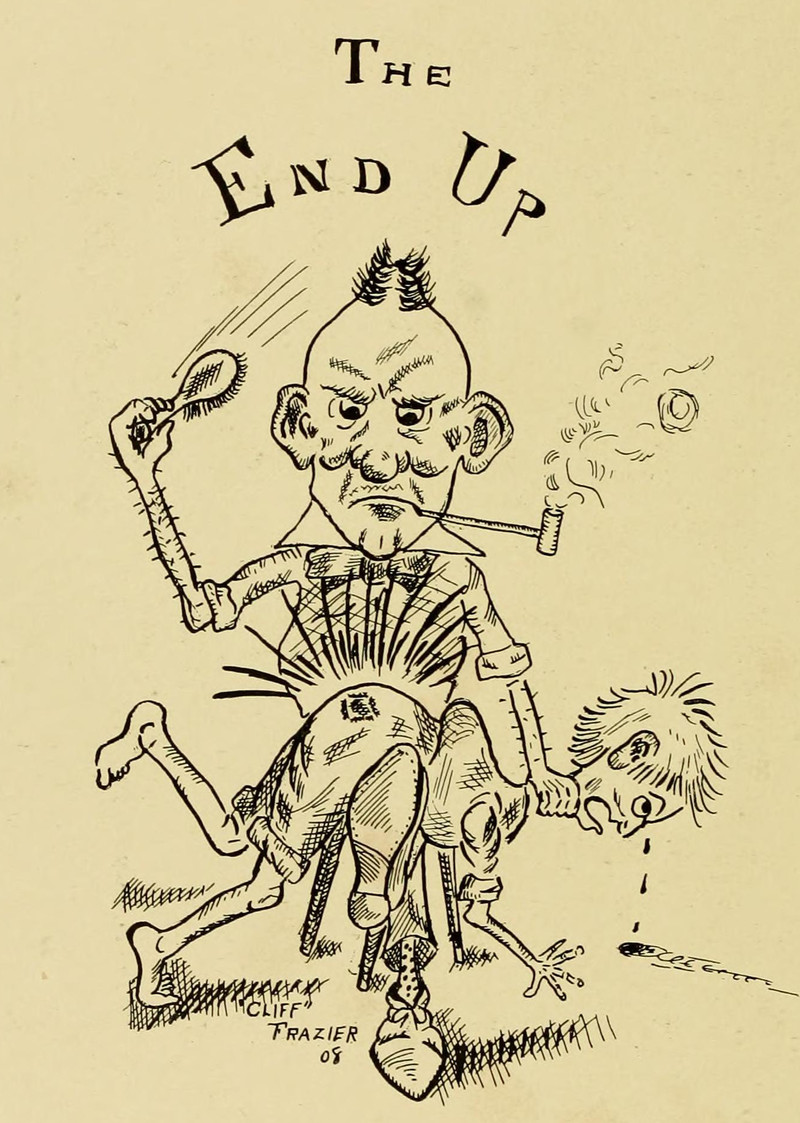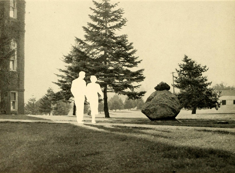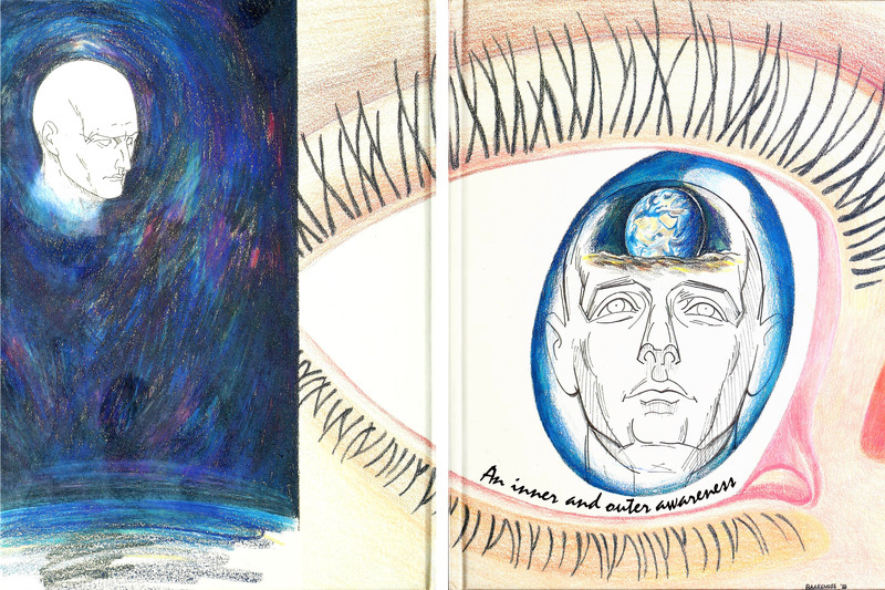 A world emerging from a head within the blue egg of a pupil, as the face in the universe looks on. This sort of thing is why we prefer people to wear sunglasses. From Taylor's 1989 yearbook.