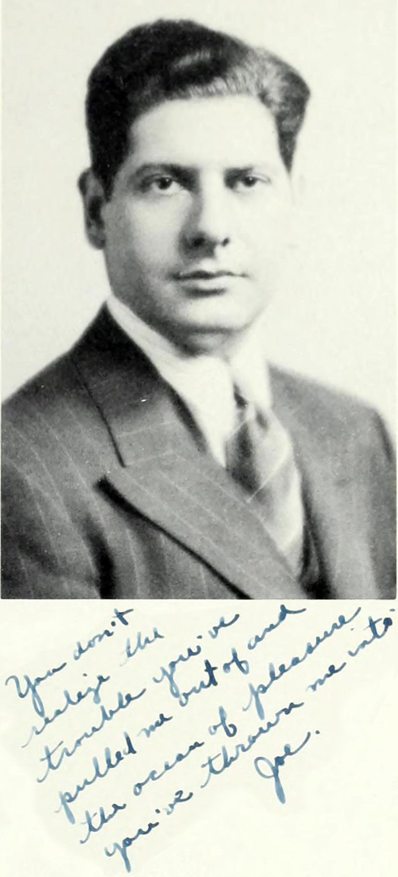 What a nice note to a beloved teacher: "You don't know the trouble you've pulled me out of and the ocean of pleasure you've thrown me into. —Joe." That's Joe pictured, from back when students had dignity. From Salem's 1939 yearbook.