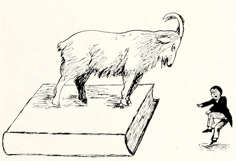 #vintage illustration #goat #vintage yearbook #yearbook #giant book #tiny man #giant goat #1910s