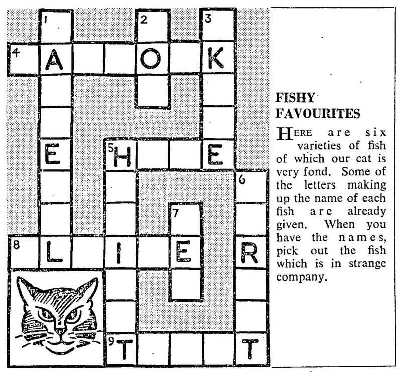 From The Children's Newspaper, 1959. Across: 4 Haddock, 5 Hake, 8 Plaice, 9 Trout. Down: 1 Mackerel, 2 Cod, 3 Skate, 5 Halibut, 6 Turbot, 7 Eel.