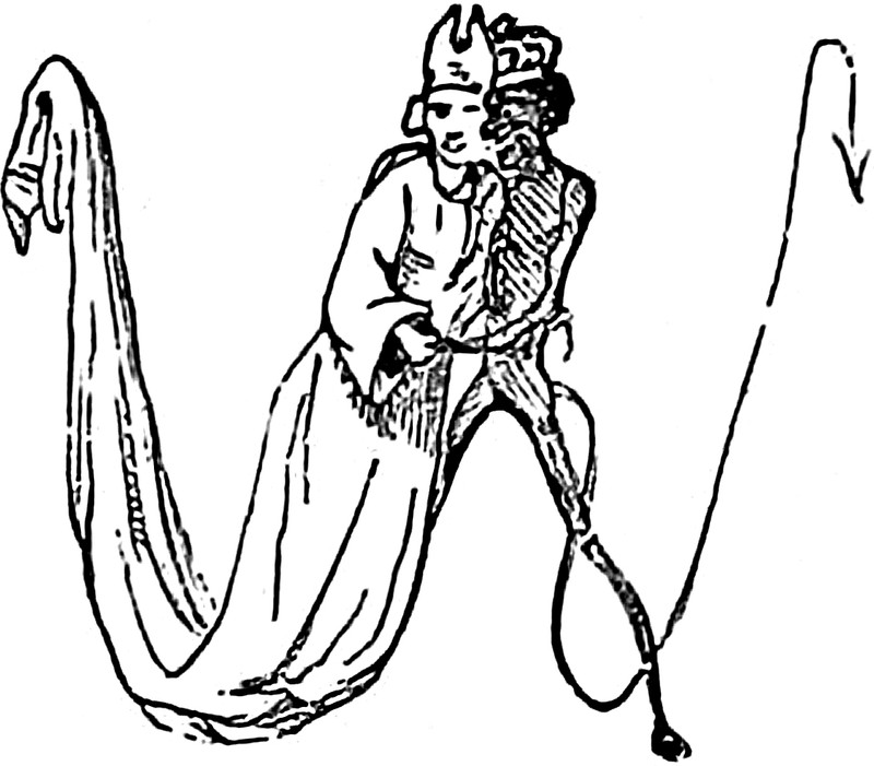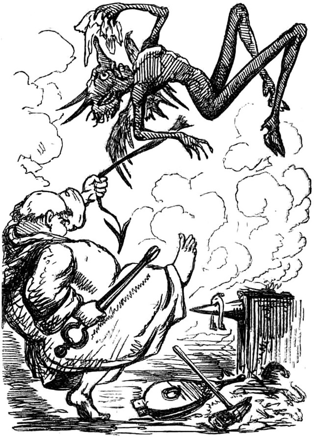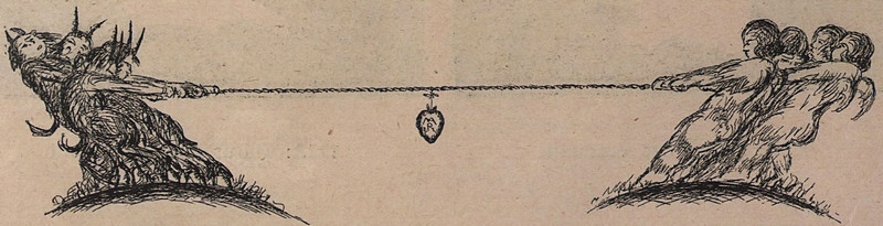 The central figure is perhaps wondering, "So it's snakes, wings, and fire on the one side, and what's the other side promising again?" From The New England Primer by Heman Humphrey, 1830. Speaking of which, what exactly are a snowball's chances in hell? See A Snowball's Chance in Hell.