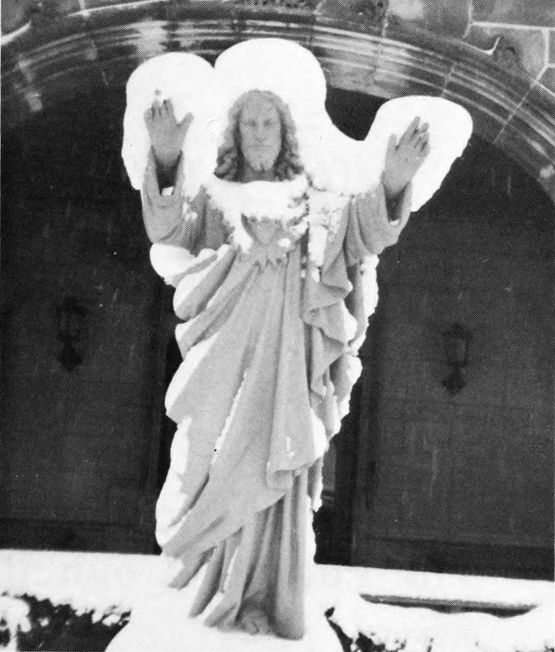 An X for a halo? Presumably it's the tail end of the ichthys symbol ("sign of the fish") of Christianity, but we've never before encountered it this way (we have gaps!) The red "64" sticker seems like a sun that Jesus is warding off. The sun and the Son. In mathematics, 64 is known as a " centered triangular number" (symbolic here of the Holy Trinity?) Of course, there are 64 demons in the Dictionnaire Infernal, and 64 hexagrams in the I Ching, and 64 squares on a chess board, so there are many (unsatisfactory) ways to interpret the cover of Sacred Heart's 1964 yearbook.