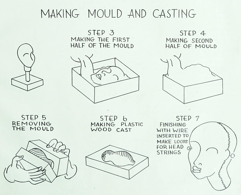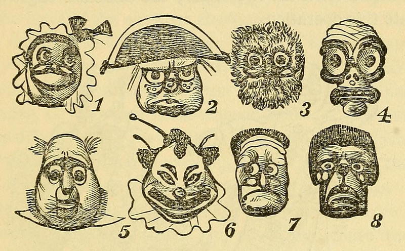 Puppet faces (Judy, Policeman, Foreigner, Ghost, Doctor, Clown, Jones, Hangman) from Dick's Parlor Exhibitions by William Brisbane Dick, 1882.