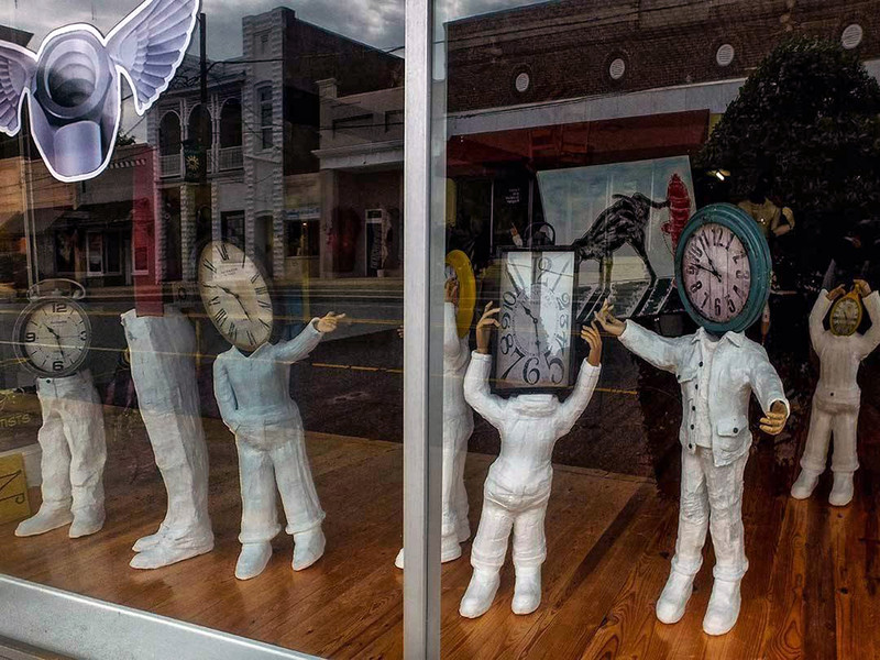We spotted a temporal anomaly while virtually re-visiting the charming Danish village of Solvang, California via Google Street View. Facing south, the clocks on the downtown street corner proclaim that it's 2:20. Facing north, it's 9:49. From the east and west, it's 12 36. Amazingly, when you virtually cross the intersection via Google Street View, it takes about 4 and a half hours according to the clock. Note the clock faces as you wait at the red light, then click forward and marvel at how long that light lasted! (Note: don't click too far down the road, or you'll zoom too far forward. Click just in the intersection itself so as to inch forward. You may or may not have to rotate slightly to see the clock on your left.)