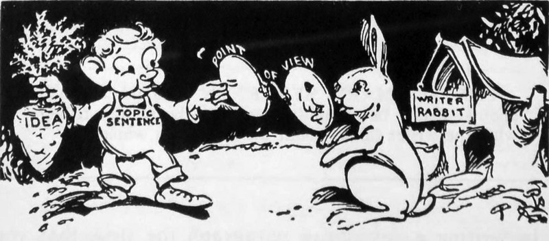 A carrot of an idea and point-of-view eyeglasses for a writer rabbit. From Using Our Language, Grade VIII by T. I. Davis, 1961.