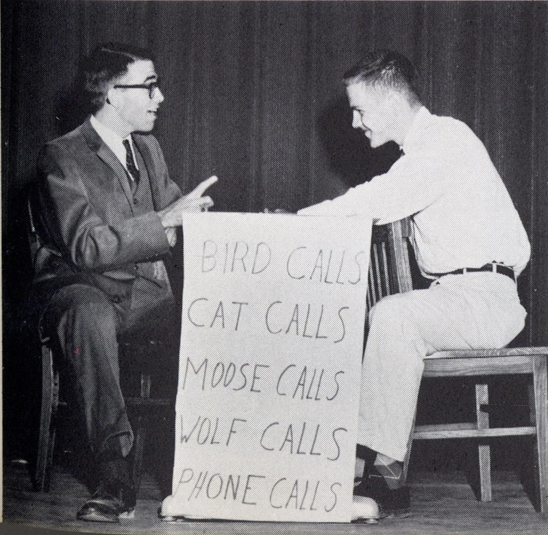 Bird calls, cat calls, moose calls, wolf calls, phone calls.  From Joplin Junior College's 1961 yearbook.