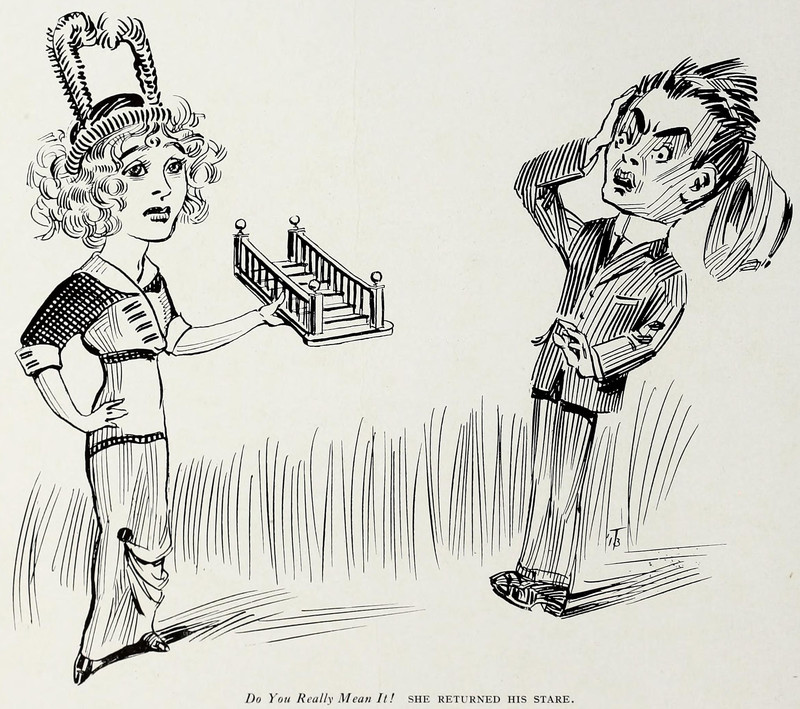 JCE notes: "The Amelia Bedelia-precursing pun raises more questions than it answers, I would say, to wit, (1) How and why did she borrow his staircase in the first place? (2) Did she somehow borrow it without his knowing? If not, why is he so blindsided by her returning it? (3) Assuming his astonished and annoyed reaction is caused, not by her returning it, but by her returning it in miniature form...well, um, how exactly did it get miniaturized? (4) Assuming the staircase was always a miniature staircase...well, then, what's the problem? She returned it in the same condition, didn't she? (5) Now, about her hat... Other possibilities that occur to me: (a) She's returning it as one would return an engagement ring. No wonder he's upset! (b) She's returning it on behalf of someone else. 'How in the world did my miniature staircase fall into your hands!' he's thinking."
