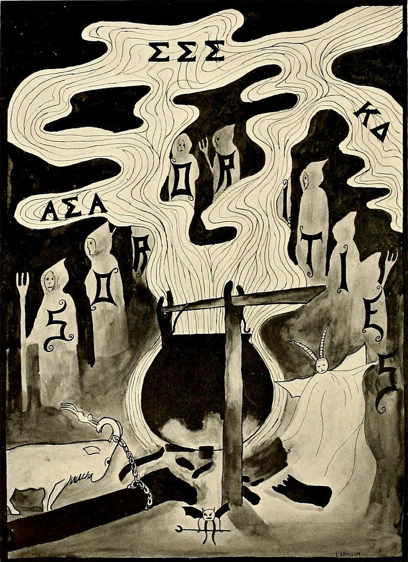 Three favorite details near the bottom of the image: the tiny figure hanging onto the tethered goat's horns, the bat imp with the crescent pitchfork, and the long-horned moth-like demon rising from the cauldron's flames. From the 1913 yearbook of the State Female Normal School, Farmville. See How to Hoodoo Hack a Yearbook.