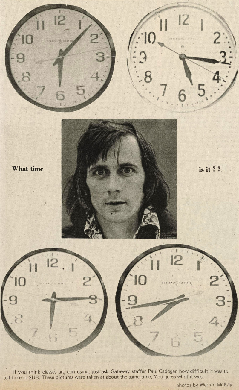 A temporal anomaly in Edmonton, Alberta -- four clocks photographed around the same time in the university's student union building, whatever that time may have been. From The Gateway, Nov. 6, 1973.
