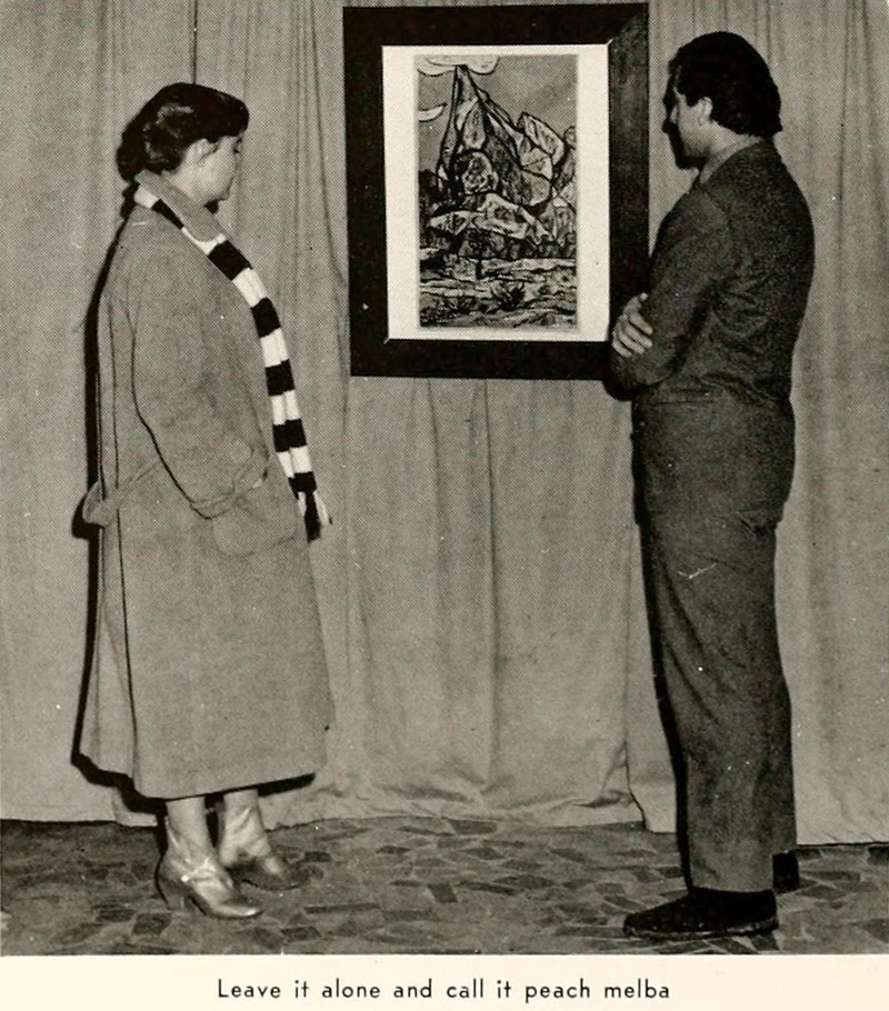 Only funny to a Southern sensibility: the captions read, "Now, Miss Polly, will you serve us cocoa?" and "Leave it alone and call it peach melba." From Sewanee's 1960 yearbook.