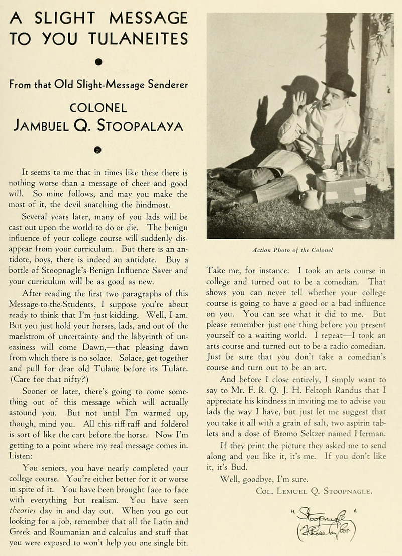 By the time he signs his message, Colonel Jambuel Q. Stoopalaya is transformed into Col. Lemuel Q. Stoopnagle. We also appreciate the references to Mr. F. R. Q. J. H. Feltoph Randus and to the dose of bromo-seltzer named Herman. From Tulane's 1933 yearbook.
