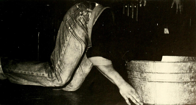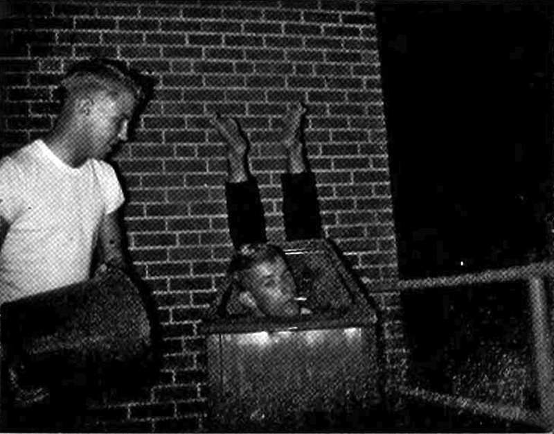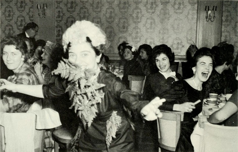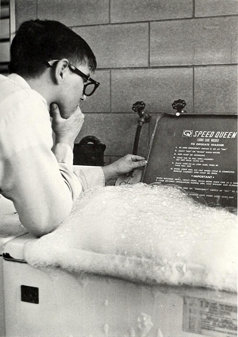 While we appreciate that there are in fact a dozen members of the Intensely Vigorous College Nine, a single mop wig isn't enough to say "zany exhuberance [sic]." From University of Saskatchewan's 1964 yearbook.