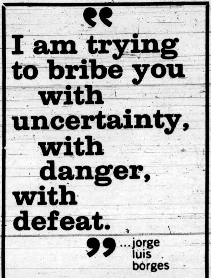 "I am trying to bribe you with uncertainty, with danger, with defeat" —Jorge Luis Borges.  From the UCLA Daily Bruin, 1974.