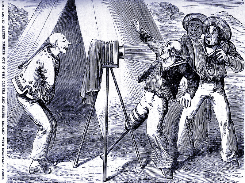 "Some liquid matter rushed out of the camera and struck Eddard with startling force," from Wonderful Ching-Ching: His Further Adventures by Edwin Harcourt Burrahe, 1886.