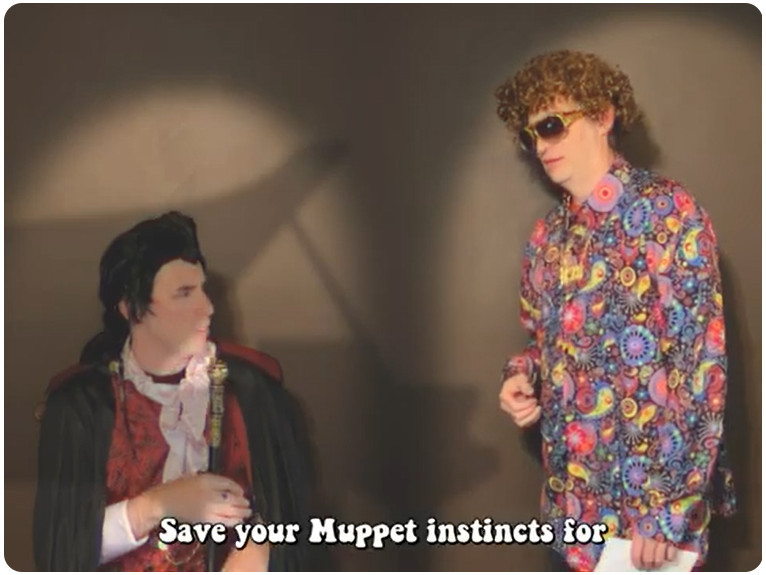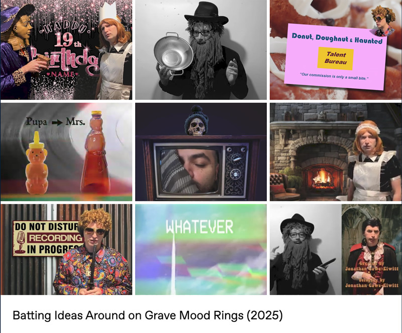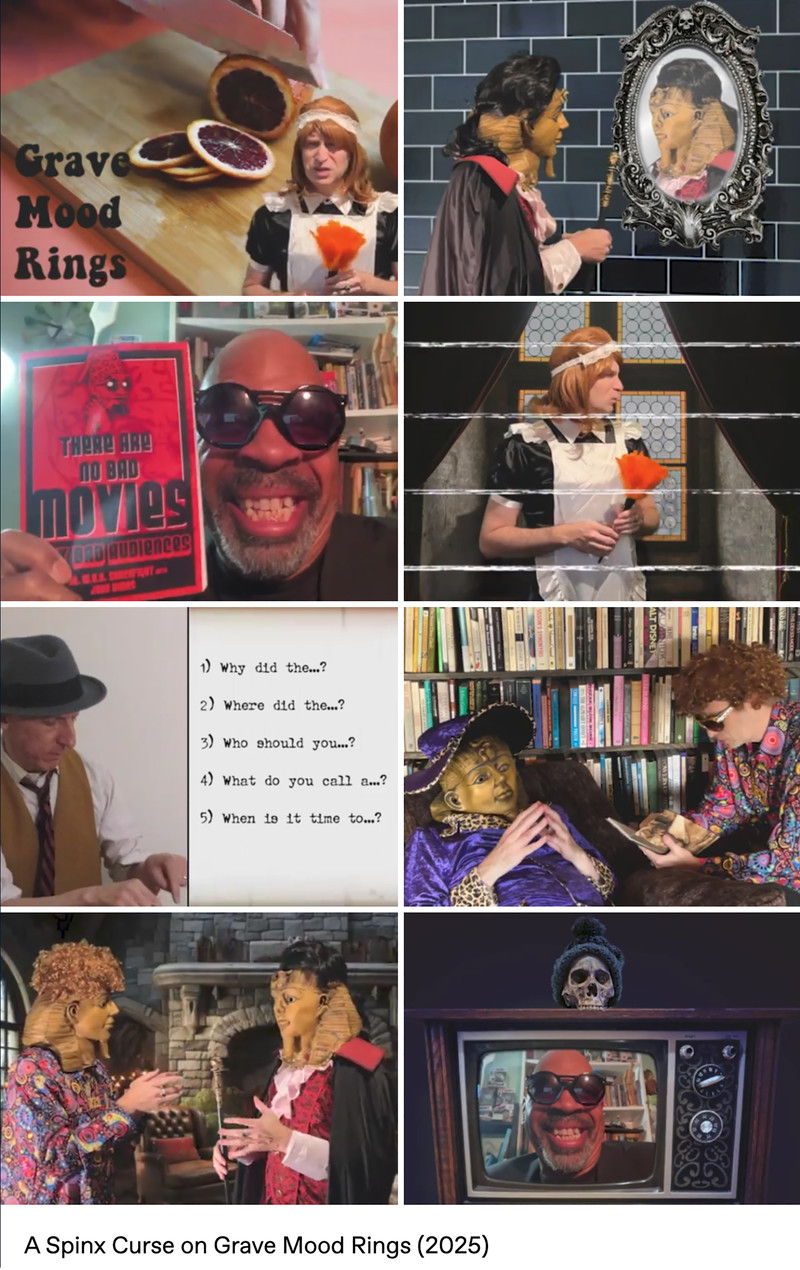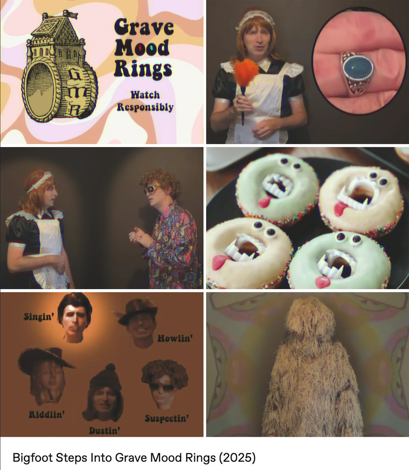 Parody analog horror meets 1970s tropes (like pet rocks, lava lamps, disco music, bell-bottom pants, mirror balls, and of course mood rings) in the web series Grave Mood Rings. It pokes fast fun at classic slow-moving Gothic soap operas like Dark Shadows and the Canadian series Strange Paradise. In addition to a vampiric Viscount, a castle is home to a groovy Doctor (a phlebotomist, naturally), a jolly housekeeper with her own laugh track, a werewolf Vicar, and an arch-nemesis riddler wearing a Sphinx mask. Corny wordplay, the occasional bizarre sing-a-long, and haunted doughnuts punctuate the proceedings, in the tradition of the sketch comedy of MadTV, Kids in the Hall, and SCTV.